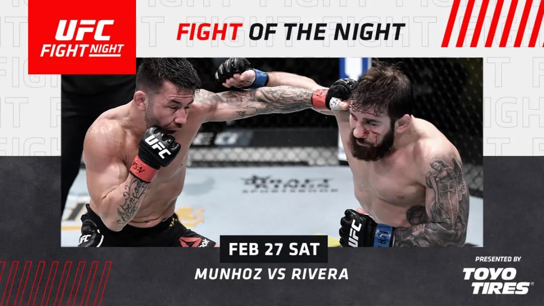 两人曾交手一次,当时的胜利属于里维拉,如今二度遭遇,他继续大展拳法。即便对手的抱架很高,他的左勾拳和右直拳依然多次精准命中。但穆尼奥斯的小腿低扫威力更大,数次踢倒对方,有效削弱移动,将其重创,他最后通过一致判定(30-27, 30-27, 29-28)成功复仇。