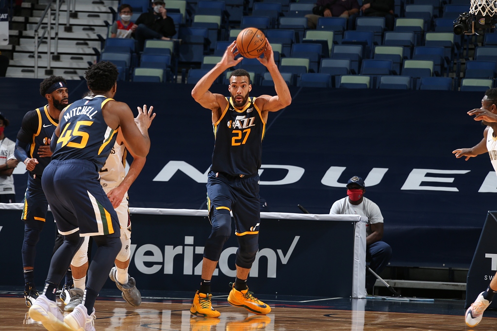 米切尔场均24.5分,5.3次助攻,4.6个篮板,两届最佳防守球员戈贝尔场均抢下13.4个篮板(联盟第3位),场均抢下2.7个盖帽(联盟第2位),创下职业生涯新高。