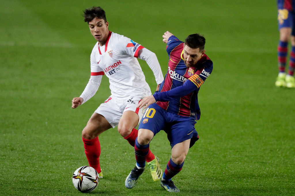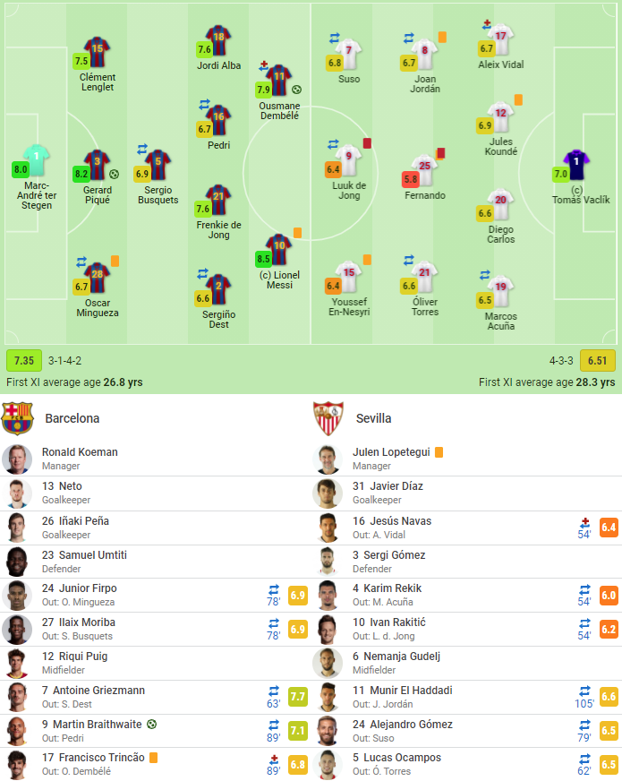 塞维利亚首发:1-瓦兹利克、17-亚历克斯-比达尔、12-孔德、20-迭戈-卡洛斯、19-阿库尼亚、25-费尔南多-雷格斯、8-霍尔丹、21-奥利弗-托雷斯、7-苏索、15-恩内斯里、9-吕克-德容