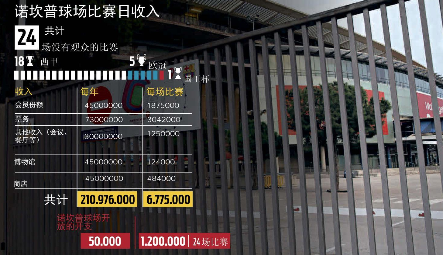 不对观众开放的诺坎普球场意味着俱乐部财政收入的巨大损失。疫情至今,在没有观众的情况下,巴萨在诺坎普踢了24场比赛,其中包括18场西甲、5场欧冠、1场国王杯。