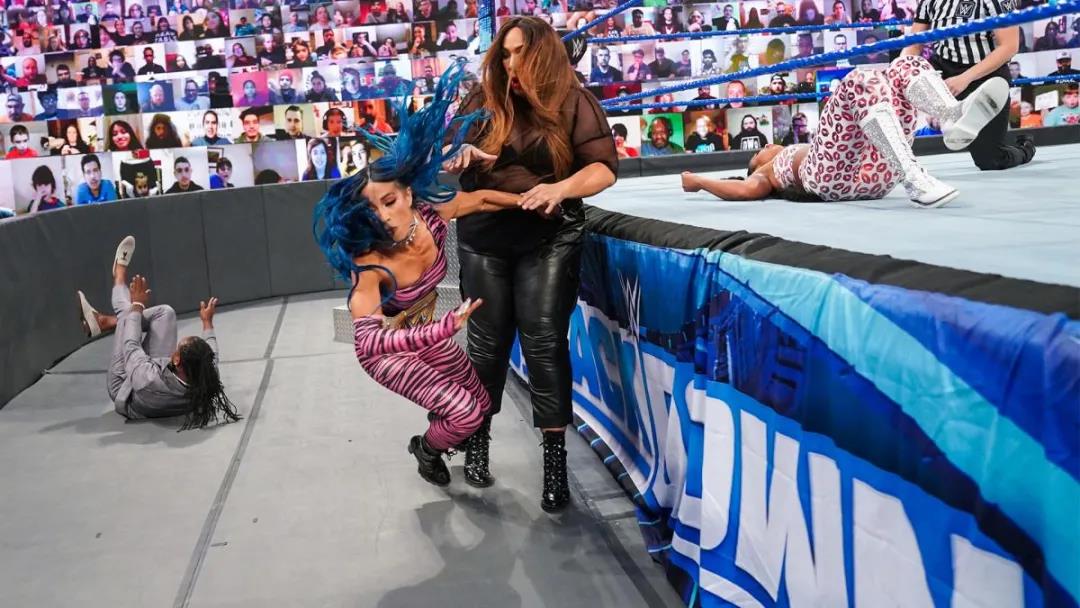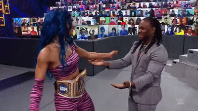 现任SD女子冠军莎夏-班克斯与比安卡-贝莱尔可谓亦敌亦友,此前比安卡已然选定莎夏作为摔跤狂热大赛的对手,但莎夏今天仍来到场面为比安卡助阵加油。