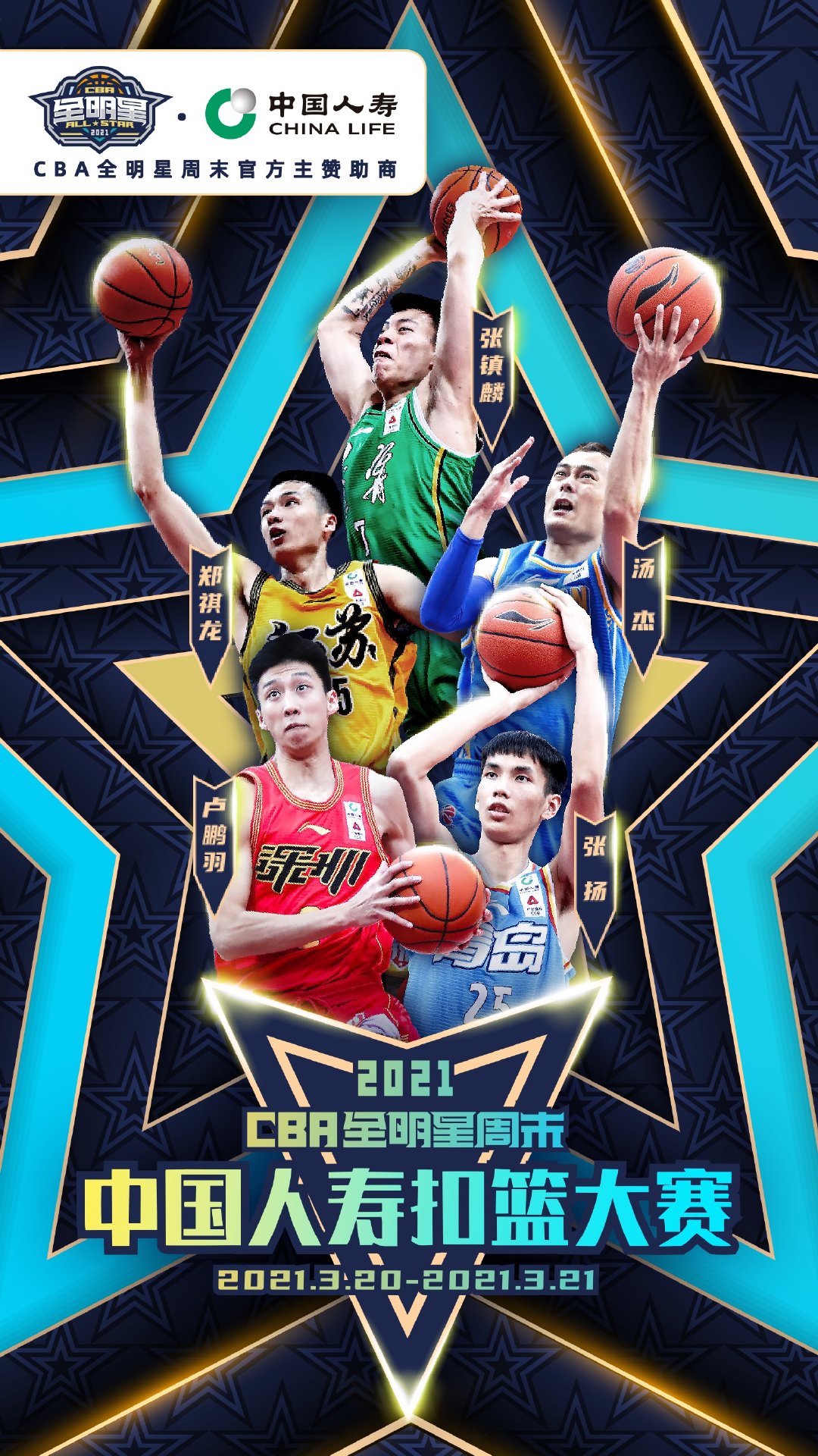 扣篮大赛名单:张镇麟(辽宁)、汤杰(福建)、郑祺龙(江苏)、张扬(青岛)、卢鹏羽(深圳)(特邀中国人寿外卡球员)