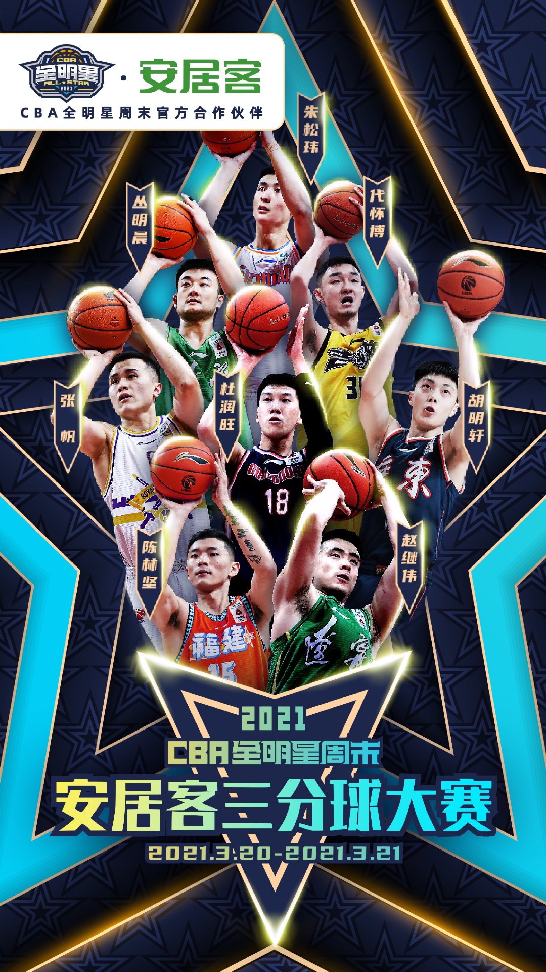 三分球大赛名单:陈林坚(福建)、赵继伟、丛明晨(辽宁)、杜润旺、胡明轩(广东)、代怀博(吉林)、张帆(北控)、朱松玮(四川)(特邀安居客外卡球员)