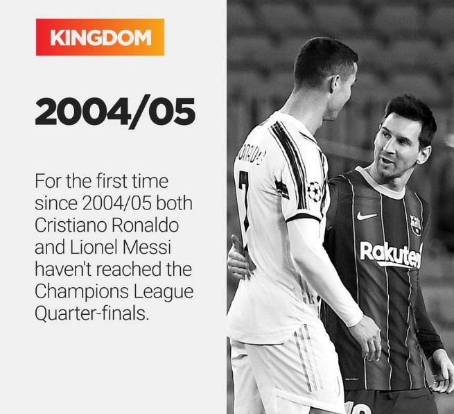 据统计,这也是时隔16年来,梅西和C罗两人首次同时无缘欧冠8强——上一次出现这样的局面还要追溯到2004/05赛季,当时C罗所在的曼联在1/8决赛中两回合不敌AC米兰,而梅西所在的巴萨则是被切尔西淘汰出局。