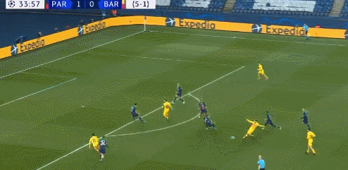 第12分钟,登贝莱在禁区外沿带球晃过后卫,这脚射门更是离谱: