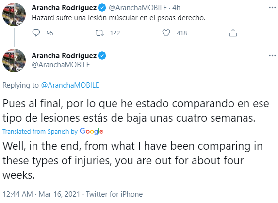 Arancha Rodriguez表示,通过同类型伤情的对比,阿扎尔此次右侧腰大肌受伤需要休息大约4周的时间。皇马与巴萨的本赛季第二场国家德比将在4月11日左右打响,阿扎尔有可能再次因伤错过国家德比。