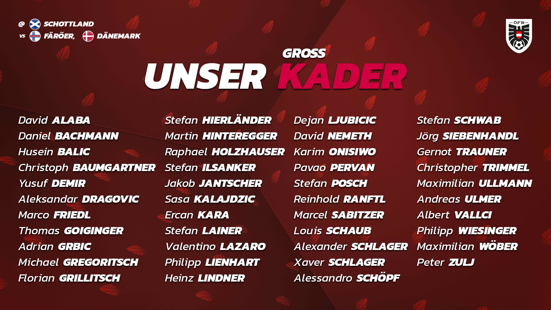 北京时间3月16日晚间,奥地利足协官方公布了新一期国家队大名单,拜仁球星阿拉巴领衔,莱比锡球星萨比策在列,主要班底由效力于德甲的球员组成。目前在上海上港效力的前锋阿瑙托维奇并未入选,根据此前消息,这一决定是出于防疫原因。