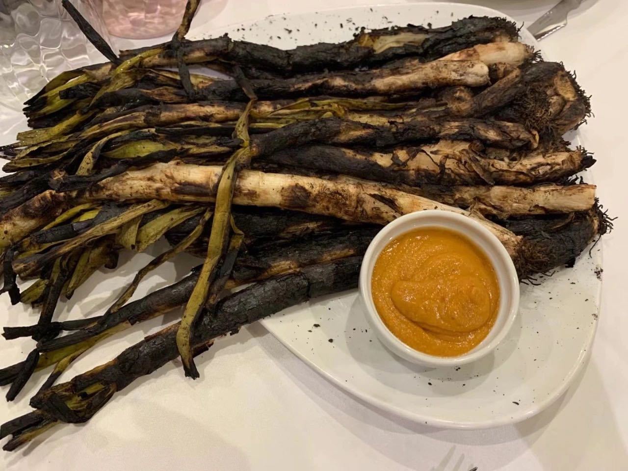 可能大家会觉得这是什么黑暗料理,这个大葱的做法很简单,就是把大葱在炭上烤,烤成图中的模样,吃法就是把烤焦的外层用手剥了后,吃里面白白的葱心,当然还要沾一些蘸料或酸辣酱。其实味道还是相当不错的,颠覆了我对大葱的印象,对我这讨厌大葱的人来说也并没有很反感,算是挺不一样的体验。