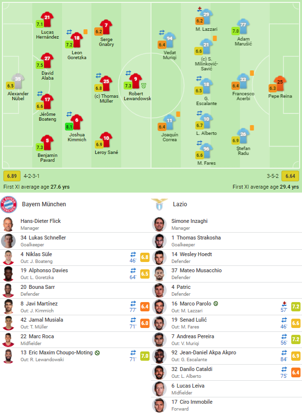 SofaScore赛后评分,基米希获评全场最高;拉齐奥首发只有一人过7。
