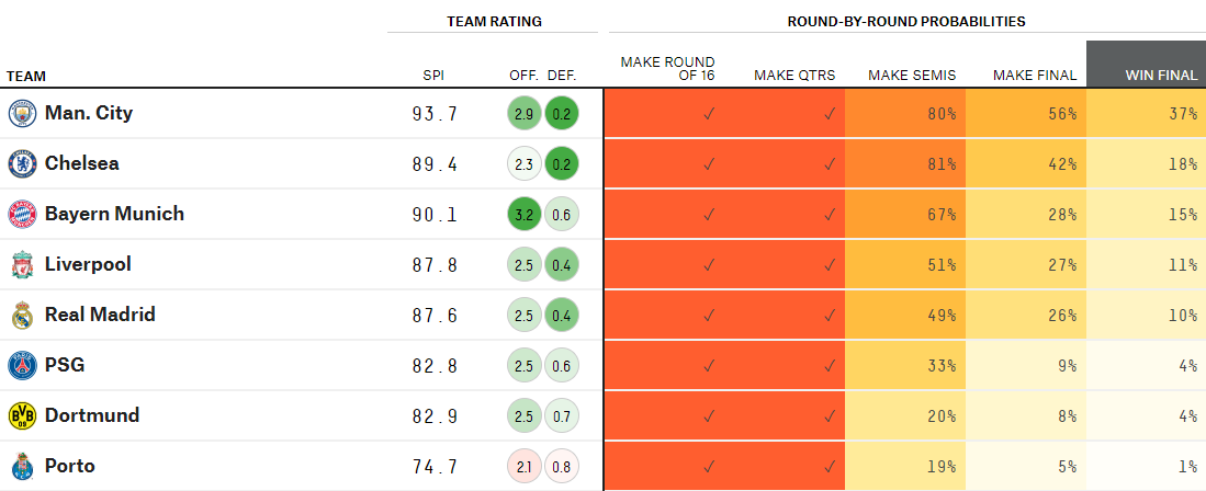 北京时间3月19日晚间,欧冠八强战抽签仪式进行完毕,大数据网站FiveThirtyEight也更新了对欧冠夺冠概率的预测结果。其中曼城仍然是最被看好的冠军争夺者,而上届欧冠亚军巴黎圣日耳曼在与拜仁狭路相逢后,夺冠概率已经跌至4%。