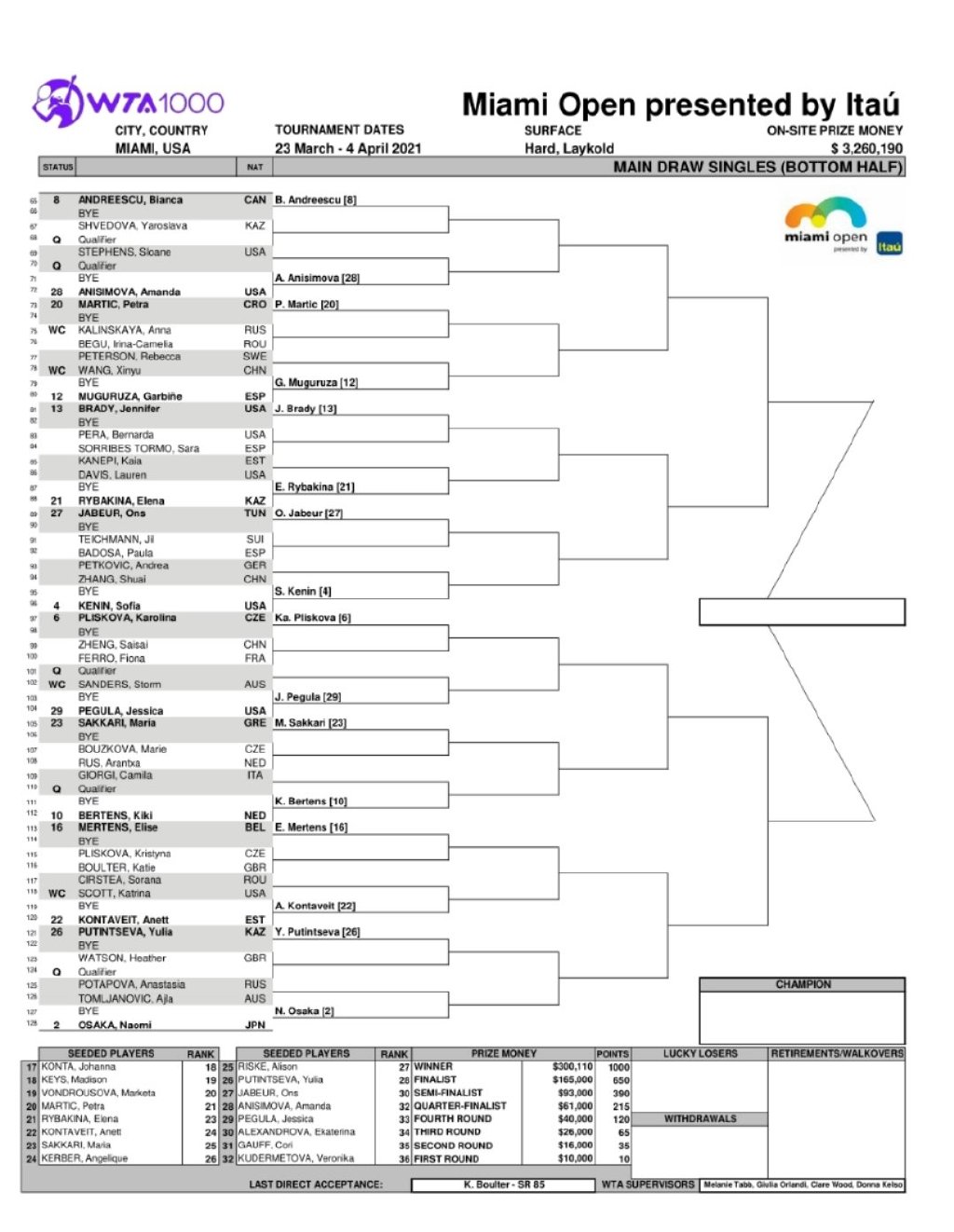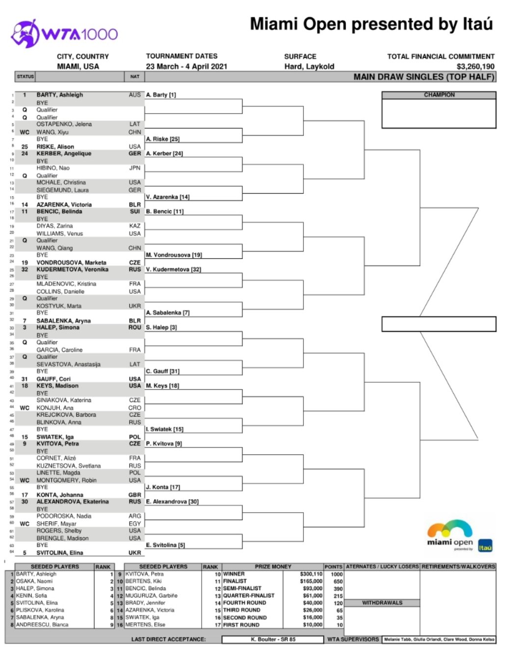北京时间3月22日,爱奇艺体育将会在3月23日全程直播的WTA1000迈阿密赛女单签表正式出炉。世界No.1巴蒂和No.2大坂直美领衔,又有势头强劲的穆古鲁扎、大满贯冠军哈勒普、科维托娃、科贝尔、阿扎伦卡、科宁等好手集体亮相。23届大满贯冠军小威退赛。整体阵容和大满贯水平几乎一样!WTA迈阿密必定会为大家奉上超精彩的对决!