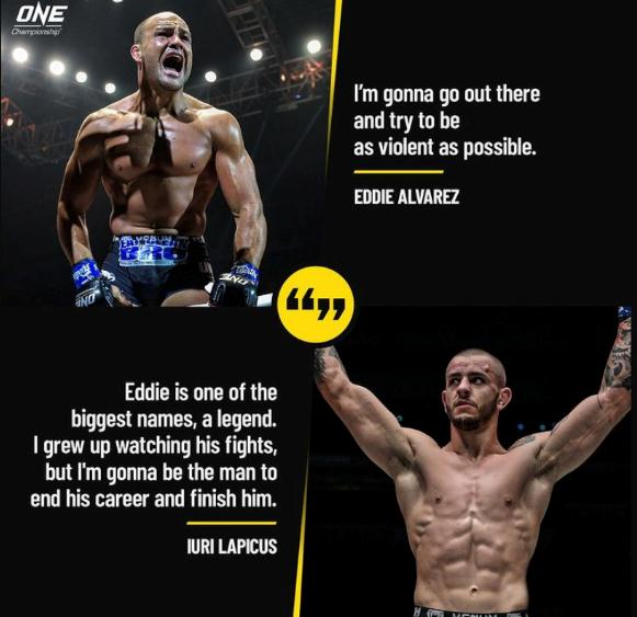 费城明星阿尔瓦雷兹在北美有着巨大的知名度,这位老将在擂台战斗近20年,拿到过Reality Fighting和Bodog Fight中量级金腰带、Bellator和UFC轻量级金腰带。在37岁的老龄,他依旧向着ONE世界冠军金腰带发起冲刺。如果能击败轻量级别排名第二的拉皮库斯,那么老将便能杀入排名,距离世界冠军更进一步。但拉皮库斯并不愿意给“地下之王”当垫脚石,甚至放言要终结阿尔瓦雷兹的职业生涯。