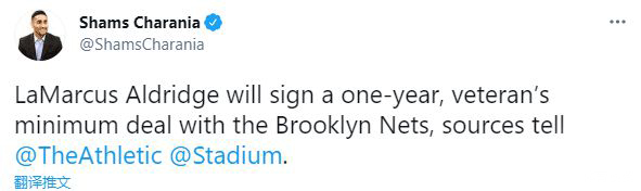 北京时间3月28日,ESPN名记阿德里安-沃纳罗斯基报道,拉马库斯-阿尔德里奇与篮网签下一份一年合同。Shams则报道,这是一份一年老将底薪合同。