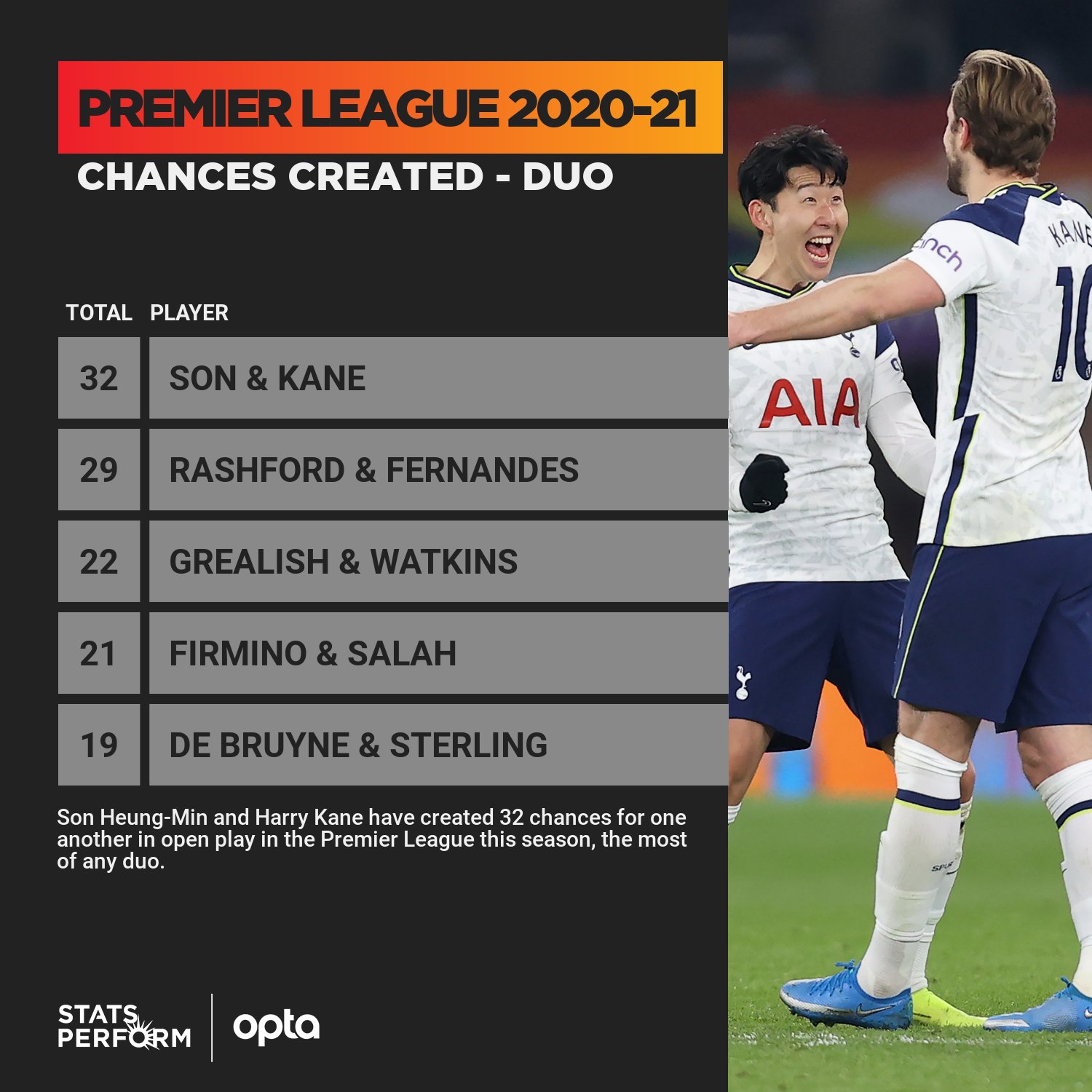 根据Opta数据统计,孙凯二人本赛季已经在英超赛场上互相创造了32次射门机会,是截至目前英超联赛中互创机会最多的二人组。