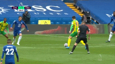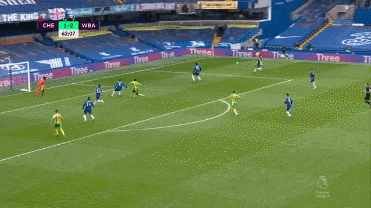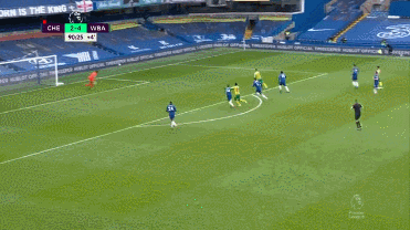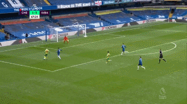 13' 维尔纳越位位置接里斯-詹姆斯传中包抄抢点没能踢准球的部位。