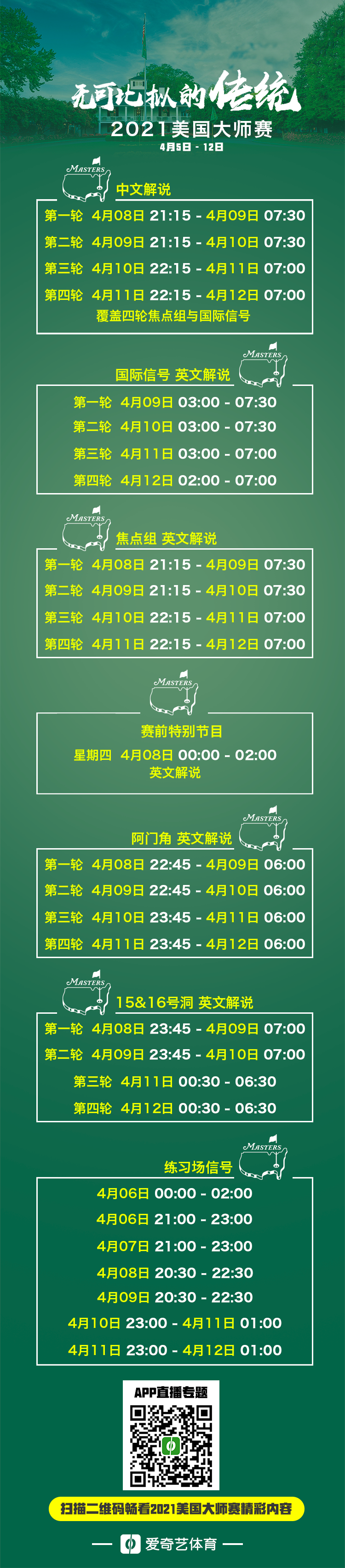 今年的美国大师赛全部赛程时间表已经正式出炉,一周时间每天都有不同精彩在等着你。同时,国内顶尖解说团队也会为大家带来精彩点评,我们的中文解说将覆盖四轮焦点组与国际信号。