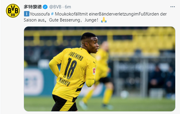 北京时间4月5日,多特蒙德官方宣布,球队新星穆科科因脚部韧带受伤赛季报销。