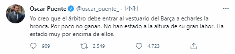 比赛结束后,他再次发推,矛头直指裁判:“我认为裁判应该去巴萨更衣室骂他们,他们根本没赢。裁判没有辜负自己伟大的工作,远远超越了他们(巴萨球员)。”