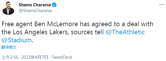 北京时间4月7日,据NBA名记Shams Charania报道,本-麦克勒莫同意加盟洛杉矶湖人,并签约到本赛季结束,在签下了麦克勒莫之后,湖人的阵容名单达到满额。麦克勒莫此前被火箭裁掉,成为完全自由球员。本赛季迄今,麦克勒莫在场均16.8分钟的出场时间里能够贡献7.4分2.1篮板0.9助攻,三分命中率为33.1%。