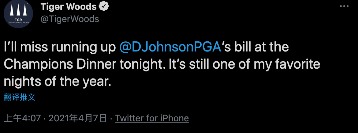 伍兹也在推特上给晚宴的主人达斯汀·约翰逊发了一条有趣的信息:“我会怀念今晚在冠军晚宴上欠下的账单,这仍然是我一年中最喜欢的夜晚之一。”