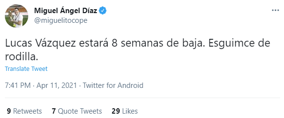 科贝电台皇马跟队大佬记者Miguel Ángel Díaz透露,巴斯克斯此次恐伤缺8周。考虑到本赛季余下赛程已经不多,这也意味着巴斯克斯将赛季报销。