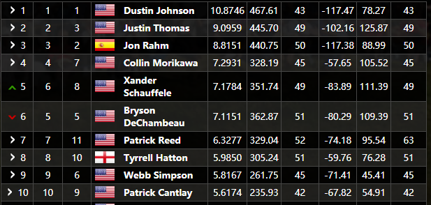 世界前十的阵容并没有发生变化,只不过顺序发生了小小的变动。在美国大师赛中赞德·谢奥菲勒以并列第三位获得35分,超越布赖森·德尚博,攀升到第五位。