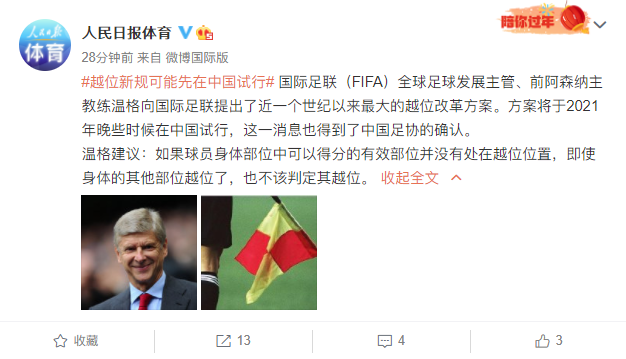 人民日报指出:国际足联(FIFA)全球足球发展主管、前阿森纳主教练温格向国际足联提出了近一个世纪以来最大的越位改革方案。方案将于2021年晚些时候在中国试行,这一消息也得到了中国足协的确认。