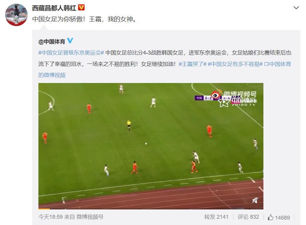 韩红的情绪最为激动,他转发了女足晋级的集锦,直呼王霜就是他的女神。