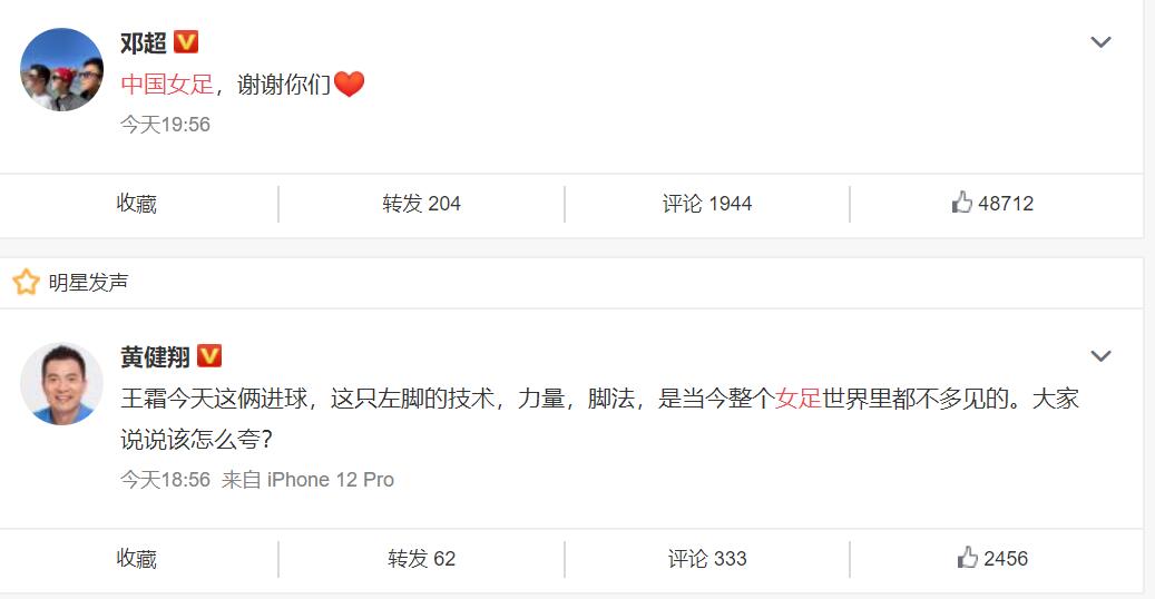 邓超发的非常直接,他写道:中国女足,谢谢你们。黄健翔也是盛赞了王霜的脚法,称在当今女足界都是很罕见的。