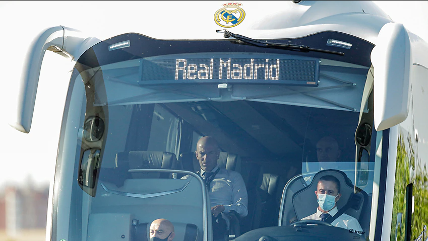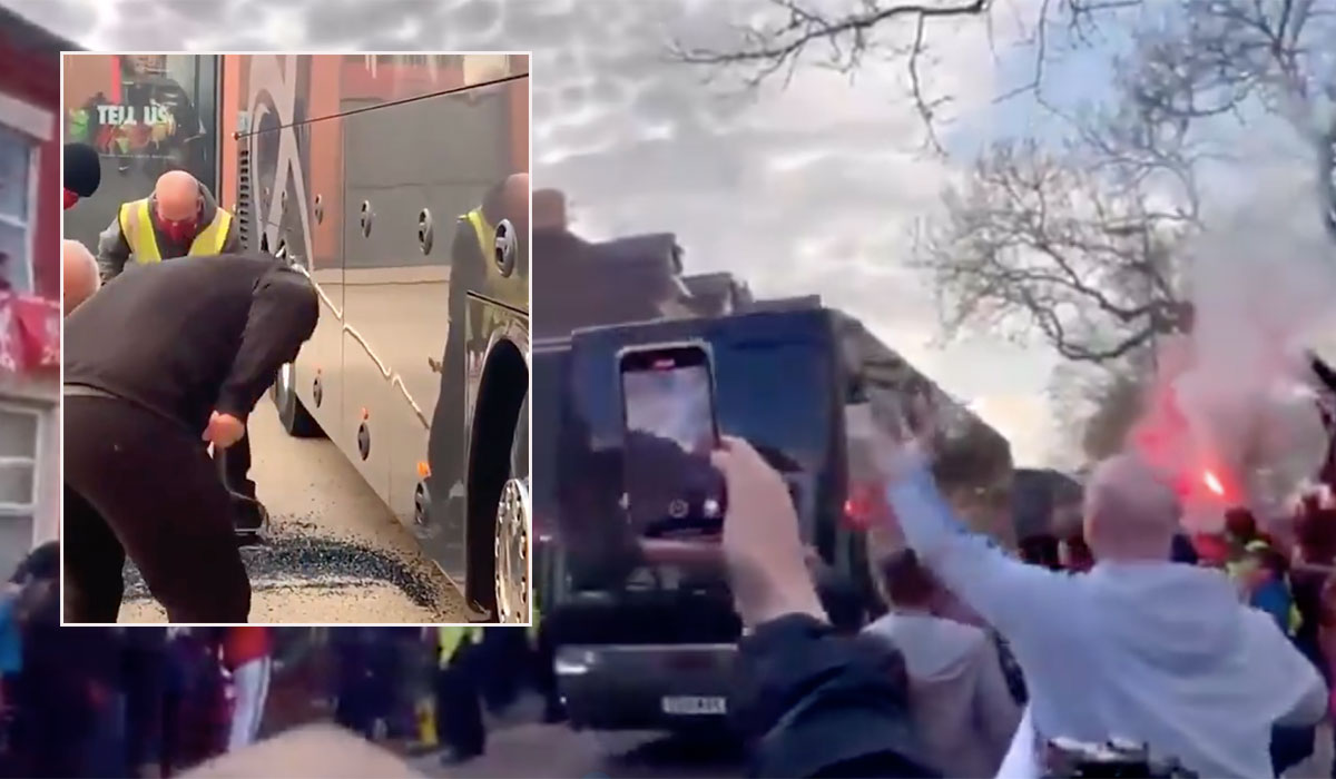手握首回合3-1的晋级先机,皇马全队于当地时间昨晚前往安菲尔德。路上,一群利物浦球迷围攻了皇马大巴,不断抛掷杂物,直到砸碎了车身右前侧的一块玻璃,这正是主帅齐达内落座的位置: