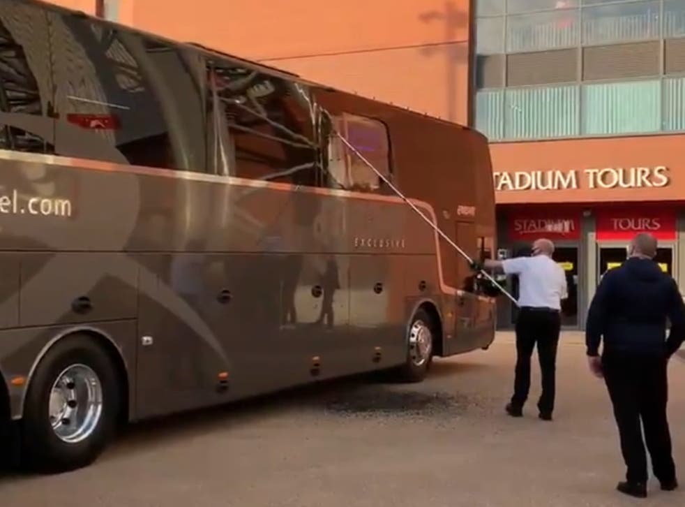 多家媒体都对此进行了报道,尽管皇马官方并没有发声,但当大巴驶入安菲尔德时,可以看到外层保护的黑色玻璃已经被砸掉一整块。工作人员正拿着长杆清理,地上掉了很多玻璃碎渣: