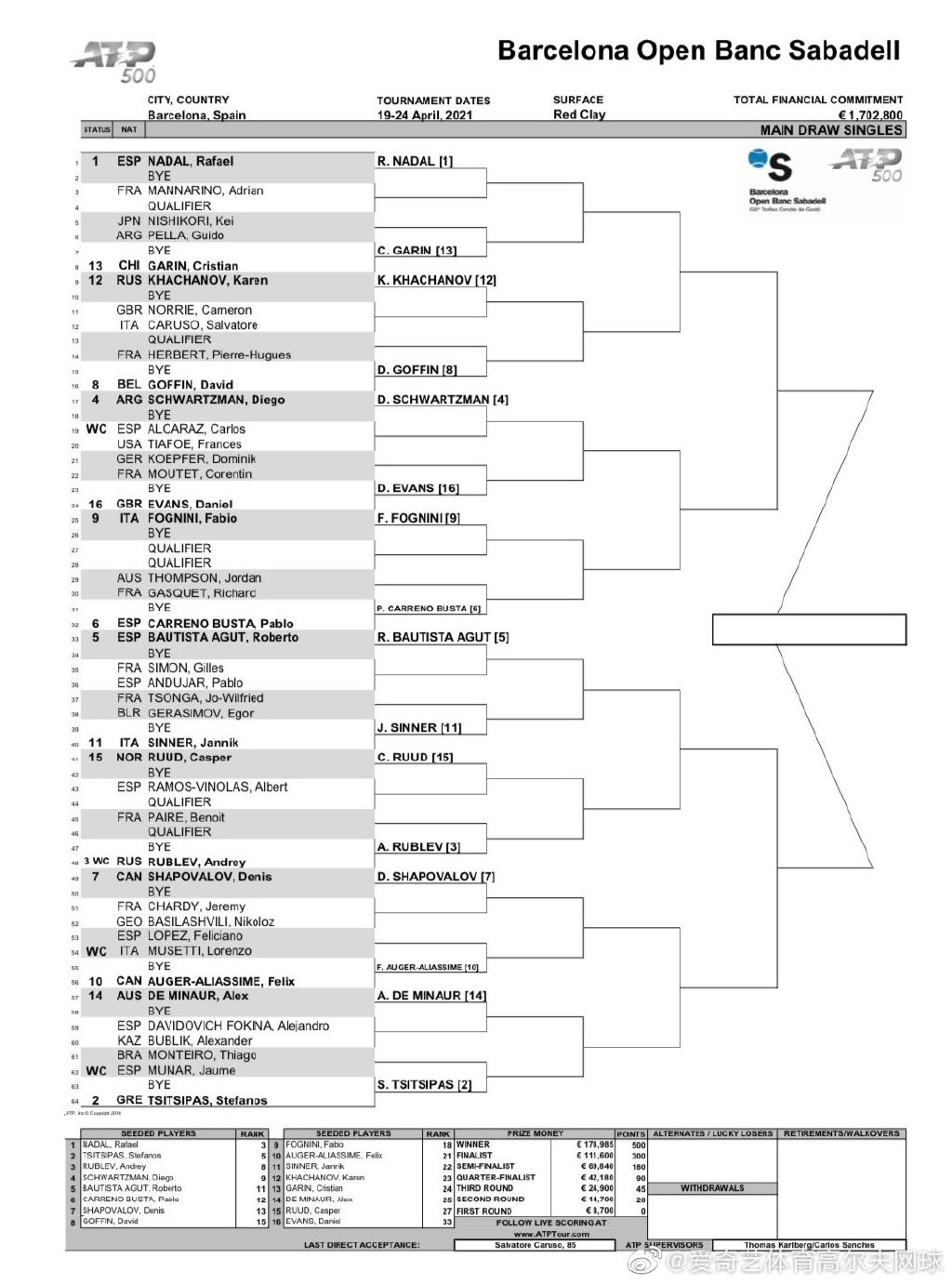 北京时间4月18日,爱奇艺体育将在4月19日开始直播的ATP500巴塞罗那站的签表正式出炉!纳达尔、西西帕斯、卢布列夫和施瓦茨曼分列前4号种子。阿古特、布斯塔、沙波瓦洛夫、戈芬、弗格尼尼、阿利亚西姆、辛纳、卡恰诺夫、德米纳尔、加林、鲁德、埃文斯分别为5-16号种子,前16种子首轮轮空。