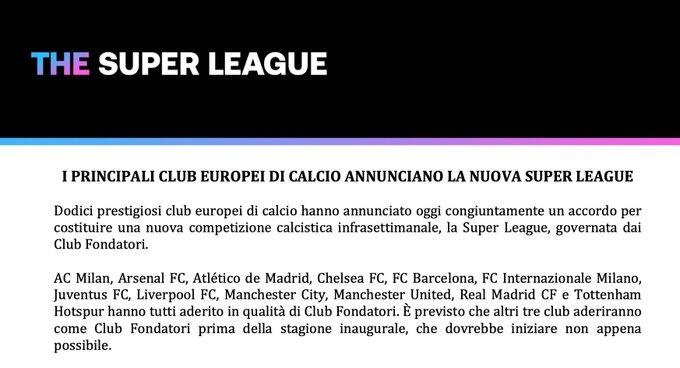 上述12家俱乐部在本次官方声明中写道:“12家欧洲领头俱乐部今天在此共同宣布,他们同意成立一个新的周中赛事:超级联赛,该项赛事将由发起的俱乐部进行管理。”