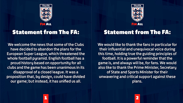 英足总在公告中写到:“我们对一些俱乐部决定放弃欧洲超级联赛计划的消息表示欢迎,因为欧洲超级联赛威胁到了整个足球世界的金字塔。英国足球因能够为所有的俱乐部提供机会而永远一段令人引以为豪的历史,足球运动一致反对封闭的联赛。从设想上来看,欧洲超级联赛很可能会分裂足球运动;但相反,它让我们团结在了一起。”