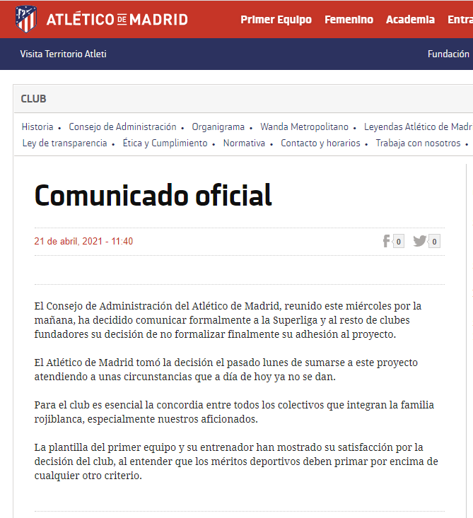 北京时间4月21日下午,马德里竞技官方发布公告,宣布俱乐部退出欧洲超级联赛。