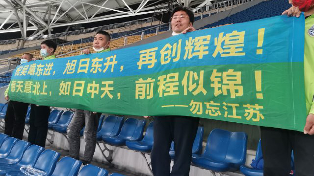 但是两位江苏旧将在苏州赛区再度相逢,却再度勾起了江苏球迷的伤心往事。本场比赛有几位江苏球迷来到了现场,手拉横幅向两位江苏旧将送上了自己的祝福。“祝吴曦东进,旭日东升,再创辉煌;愿天意背上,如日中天,前程似锦!”