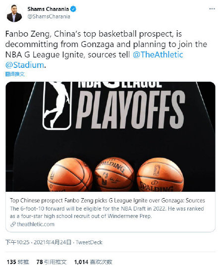 北京时间4月25日,根据名记Shams报道,今年18岁的曾凡博拒绝加盟NCAA名校冈萨加大学,并且正式进军NBA,他将加盟NBA发展联盟点燃队。发展联盟作为NBA的人才储备,华裔球星林书豪本赛季就效力于发展联盟圣克鲁兹勇士队,希望以此为跳板重返NBA赛场。此番曾凡博加盟发展联盟,这意味着他距离登陆NBA赛场也更进一步。