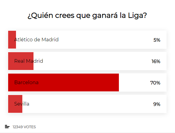 西媒《马卡报》发起球迷投票调查本赛季西甲冠军归属,结果显示巴萨最被看好,而近期状态崩盘的马竞得票甚至比塞维利亚还低。
