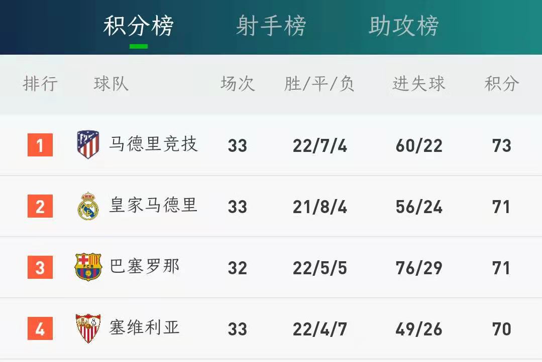 如此一来,马竞的领跑优势已经全然消失,比巴萨少赛一轮仅多2分,拱手让出争冠主动权。