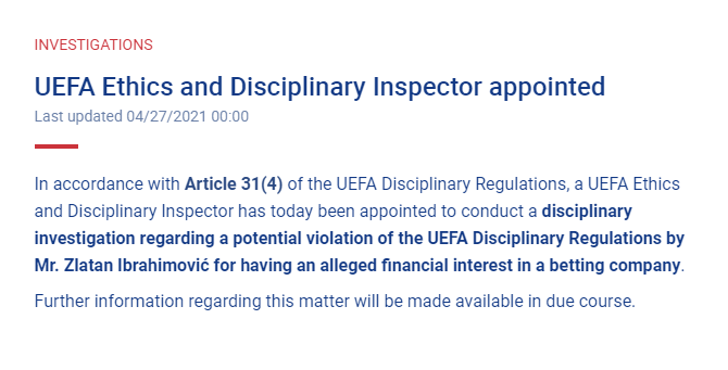 根据《欧足联纪律条例》第31(4)条,今天一名欧足联道德和纪律检查员被任命,对兹拉坦-伊布拉希莫维奇先生可能违反《欧足联纪律条例》的行为进行纪律调查,因为他涉嫌在一家博彩公司拥有经济利益。