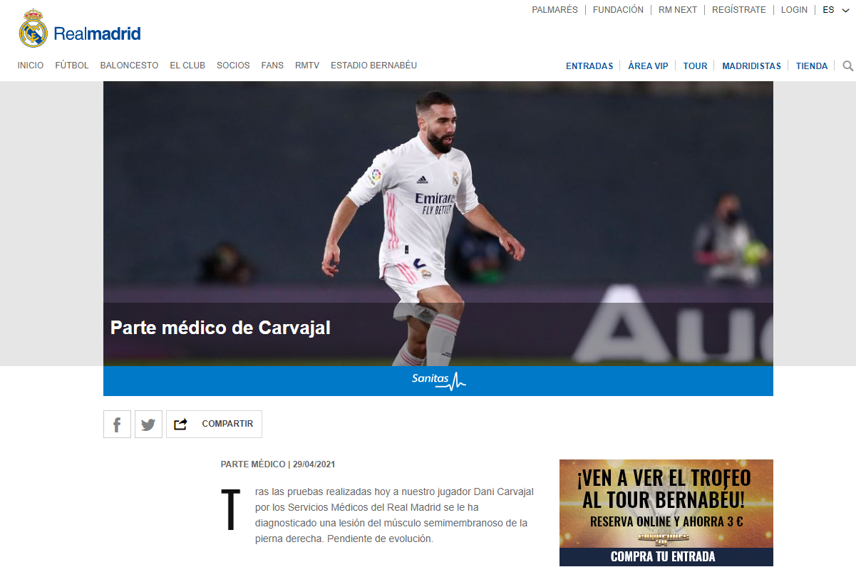 北京时间4月29日晚间,皇家马德里官方宣布,卡瓦哈尔遭遇右腿半膜肌伤病,伤情有待进一步观察。