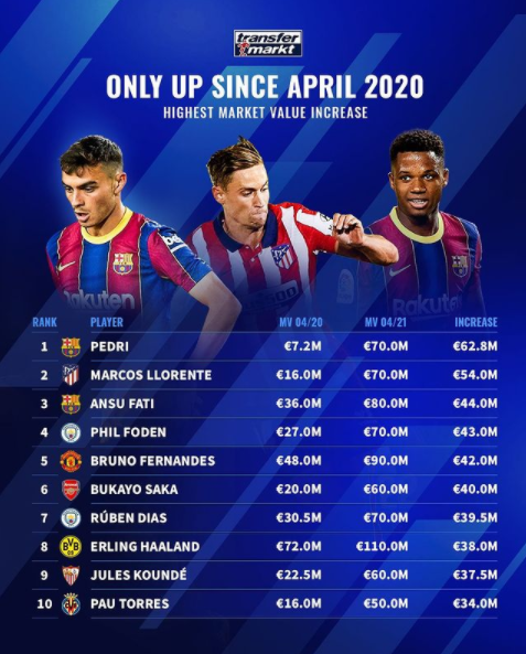 榜单前十名共有五名西甲球员、四名英超球员和一名德甲球员。巴萨队内18岁的妖人佩德里身价狂翻近10倍登上榜首,另一位未来之星法蒂尽管已经重伤超过半年,但依旧能够高居第三。