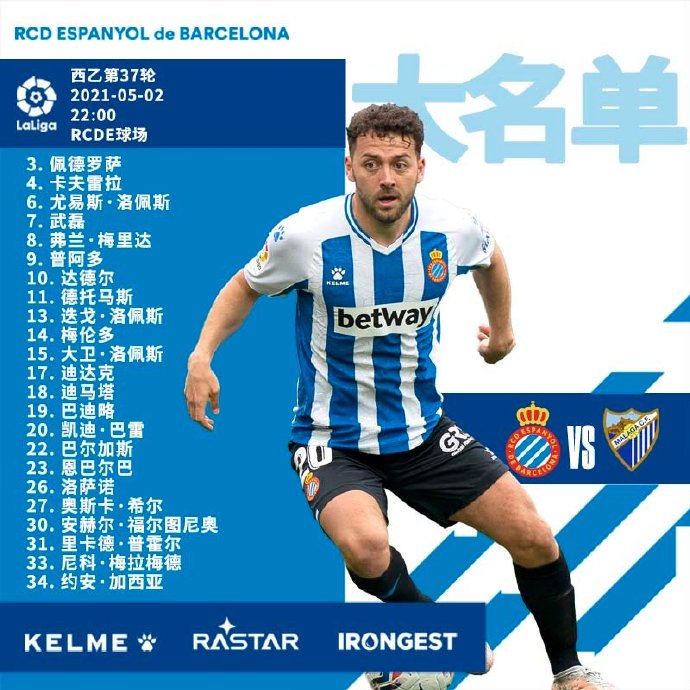 西班牙人官方公布了联赛对阵马拉加的大名单,德托马斯领衔,武磊在列,下图为具体大名单。
