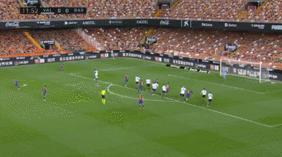 31' 梅西主罚右路禁区前沿的任意球,左脚兜出一道美妙的弧线,只可惜稍稍高出球门范围。