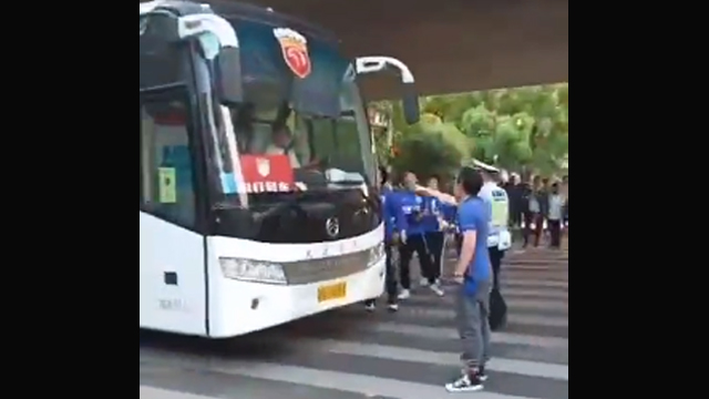 据上海海港球迷博主转载的视频,多名身穿蓝色助威服的申花球迷当街拦住了上海海港队的大巴,指向车内破口大骂,其间有一名球迷还险些被大巴车撞到。交警见此情形及时介入,但这并不能阻止申花球迷向死敌球队的大巴进行辱骂。