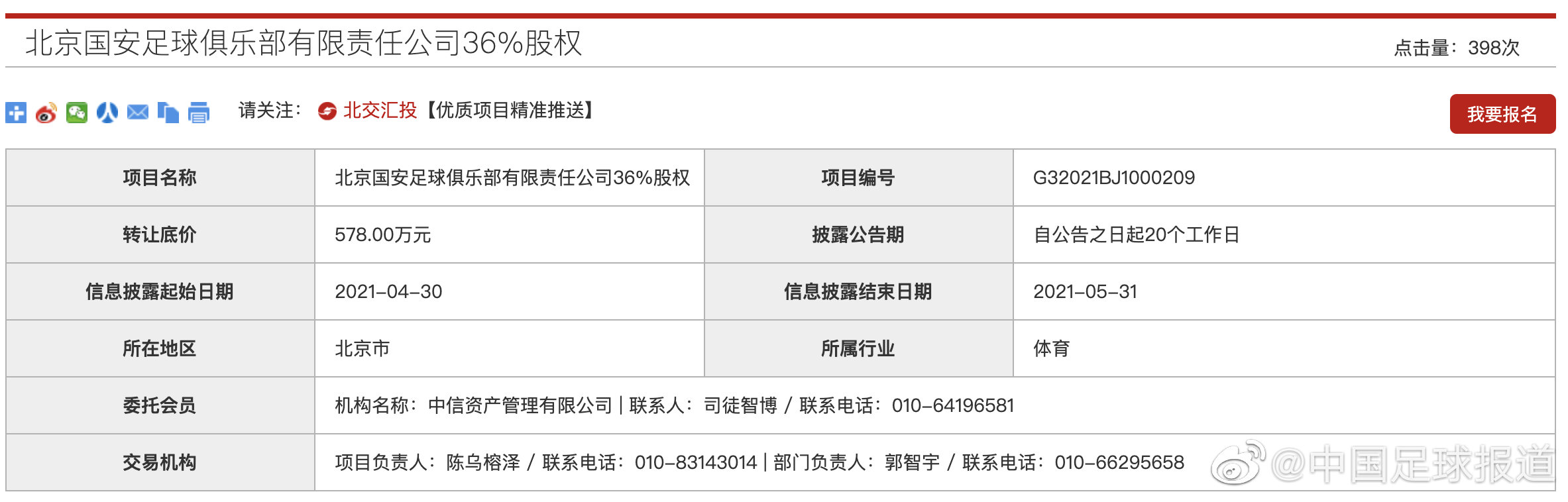 北京产权交易所官方消息,北京国安足球俱乐部有限责任公司转让36%的股权,转让方是中国中信有限公司,转让底价是578万元。