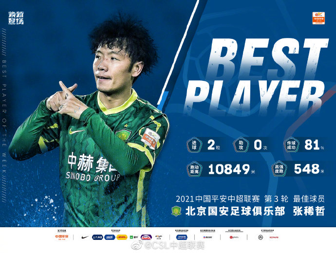 中超联赛官方公布了第3轮最佳球员,北京国安中场张稀哲当选。