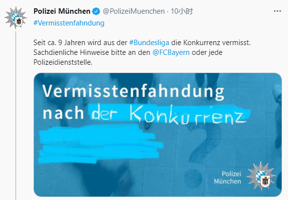慕尼黑警方在官方社交媒体发布了“寻人启事”,写道:“近九年来,拜仁在德甲的竞争对手一直处于失踪状态,有更多相关的消息请直接与拜仁或者慕尼黑警方取得联系。”在调侃的同时,慕尼黑警方还是提醒,在聚会、庆祝的过程中还是要遵守相关规定,这可不是“闹着玩的”。