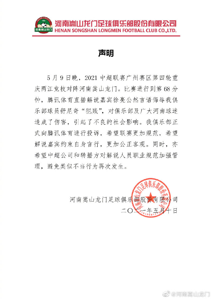 不过,河南嵩山龙门俱乐部还是对于这一言论感到强烈抗议,并于今日凌晨正式向比赛转播方提出了投诉。