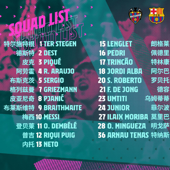 后卫:2-德斯特、3-皮克、4-阿劳霍、15-朗格莱、18-阿尔巴、20-罗贝托、23-乌姆蒂蒂、24-菲尔波、28-明格萨